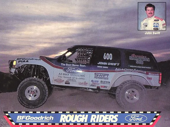 Team Four was Swift Motorsports, which started as a father and son operation, where father Ray passed his love for off-road racing down to his son John. Over the years, John amassed victories at both the Baja 500 and the Baja 1000. Swift was one of the first teams to use the Ford Ranger platform as their primary vehicle of choice for desert racing, and were the first to utilize the new electronic EEC-IV ignition system from Ford.