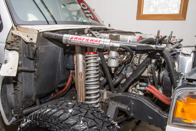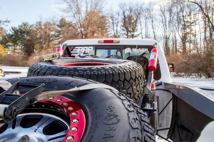 In the rear, the suspension consists of a Camburg trailing arm 3 link system. Two and a half-inch Sway-A-Way coilovers are paired with three-inch bypasses to soak up the big hits. Two-inch bump stops take it all in stride. In total twenty-four inches of travel are available before the PRP limiting straps come into play.