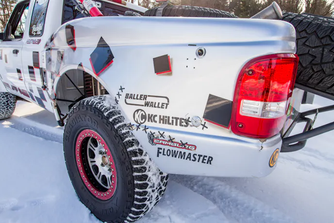 Seventeen-inch Raceline monster beadlocks allow Tyron to run low pressures. Low tire pressures are sometimes essential to being able to maintain forward progress in the sand. This is especially true of a two-wheel-drive truck that loves to carve the dunes. The wheels feature a five on five and a half inch lug pattern with ARP studs. The locks are wrapped in thirty-five-inch Gladiator XComp A/T tires. Tyson is considering stepping up to a thirty-seven-inch tire for the coming dune season. For now, these tires have been tried and true for him.