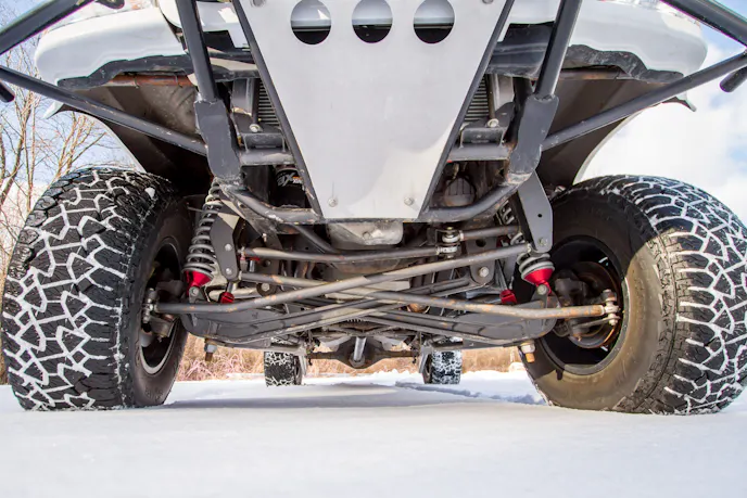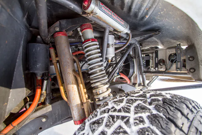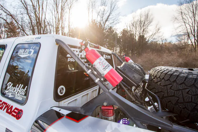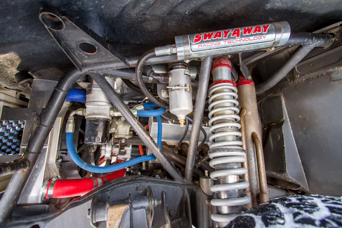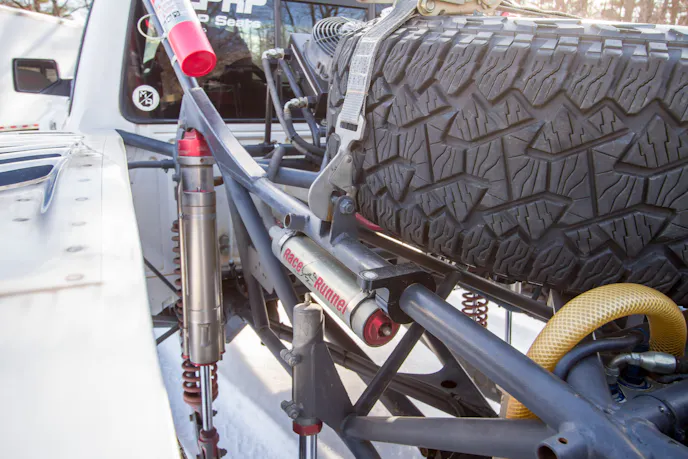 In the rear, the suspension consists of a Camburg trailing arm 3 link system. Two and a half-inch Sway-A-Way coilovers are paired with three-inch bypasses to soak up the big hits. Two-inch bump stops take it all in stride. In total twenty-four inches of travel are available before the PRP limiting straps come into play.