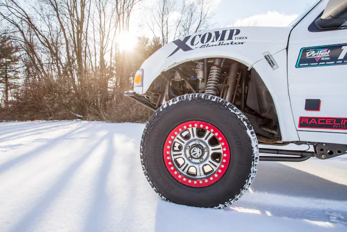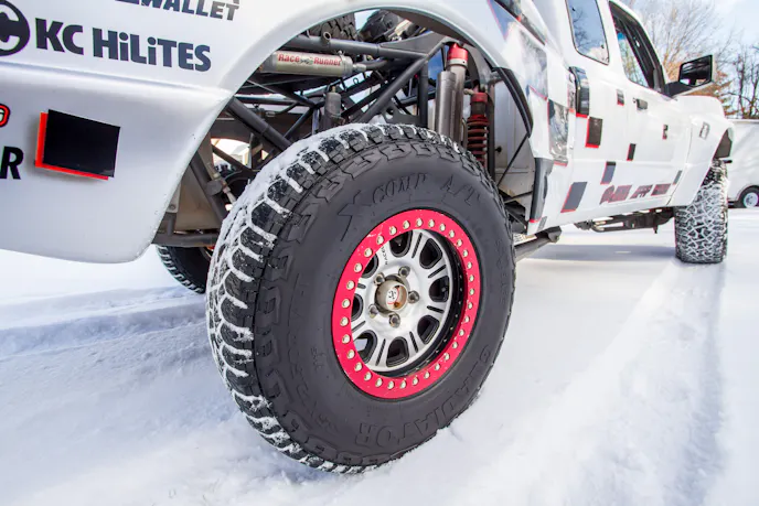 Seventeen-inch Raceline monster beadlocks allow Tyron to run low pressures. Low tire pressures are sometimes essential to being able to maintain forward progress in the sand. This is especially true of a two-wheel-drive truck that loves to carve the dunes. The wheels feature a five on five and a half inch lug pattern with ARP studs. The locks are wrapped in thirty-five-inch Gladiator XComp A/T tires. Tyson is considering stepping up to a thirty-seven-inch tire for the coming dune season. For now, these tires have been tried and true for him.