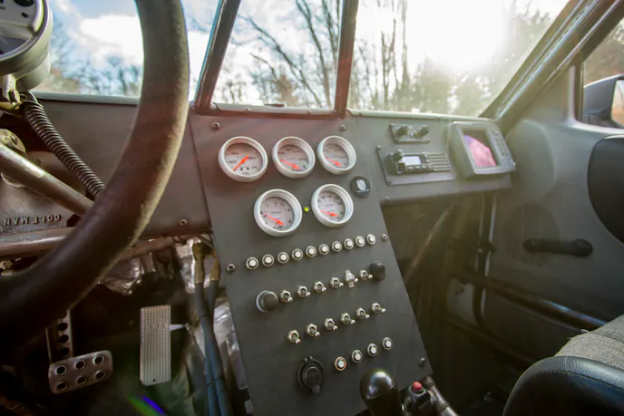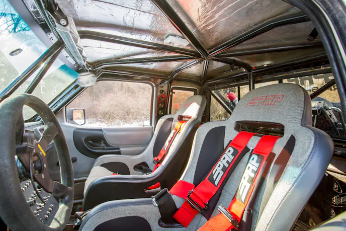 The MOMO steering wheel is a nice touch and the Rugged radio and headsets keep everyone inside in touch. An Art Car shifter helps Tyson row through the gears and the Lowrance GPS unit makes sure they never stray too far from the trail.
