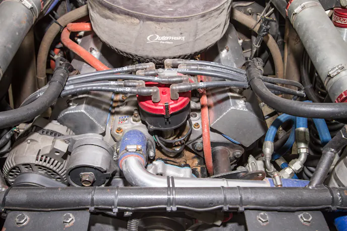 On the engine AFR 185 heads were added. A Comp Cams XE282, Performer RPM Air Gap, and Pro Systems custom carburetor round out the improvements. The exhaust consists of one and five-eighths inch primary headers. Dual three-inch exhaust with H pipe and three-inch Hooker max flow mufflers take things to the back. For cooling, a Ron Davis radiator and dual Setrab transmission coolers got the nod. An MSD 6AL ignition, Mil-spec wiring harness, 150 amp alternator, and Dual Optima red top batteries round out under the hood.