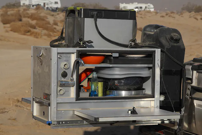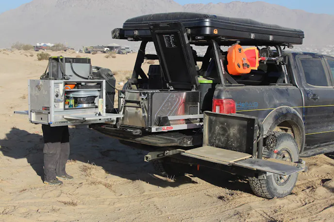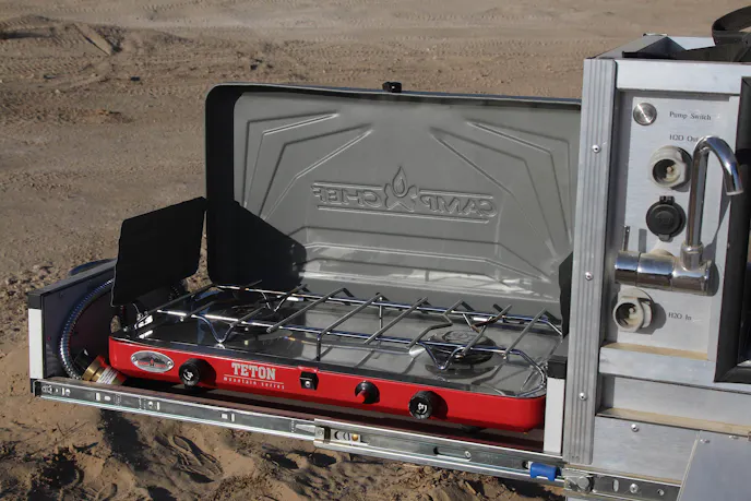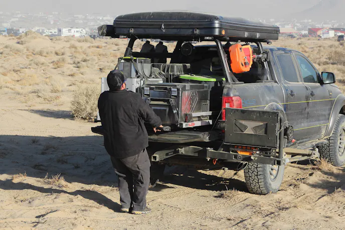 When it comes time to make dinner, the rear transforms into a tailgate kitchen. “It comes complete with a kitchen sink, of course,” commented Hallmark. Trail Kitchens provided the setup, consisting of a grill, stove, food prep area, faucet, and more. An ARB refrigerator stores the meat and veggies (and beer). It was quite a sight to see the rear turn into a kitchen in a matter of minutes.