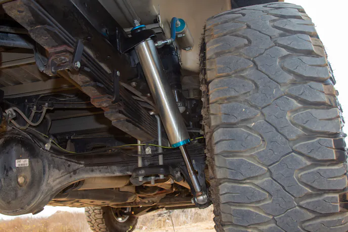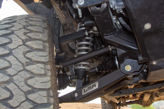 Up front, Kyle installed an LSK long-travel kit with Locked off-road shock absorbers. “I use Locked’s 2.5-inch-diameter shocks,” he explained. “Right now, it’s got their eight-inch secondaries because I’m waiting on some bypasses getting built. It rides great for right now, and it’ll only get better once the bypasses are installed.”