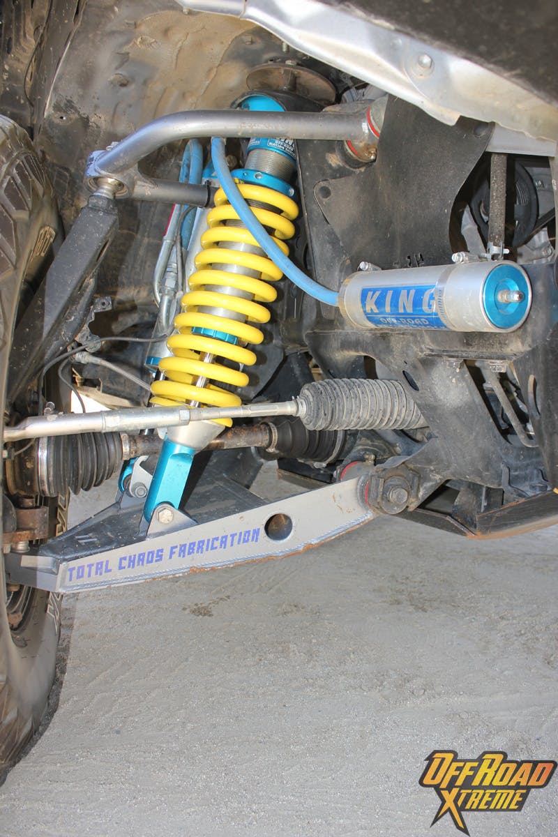 CB: The first thing I did was a “cheap-o” lift just to fit the 33-inch tires on it. I knew I was eventually going to go up from there. Then, I got a good deal on an ICON suspension kit with upper control arms. It was great, but I still wanted to go with longer travel. Total Chaos Fabrication was just down the street from me, so I went over to see what they made. I wound up buying their Travel-King coil-over kit with King triple bypass shocks on the front, and on the rear I bought the spring-under-axle kit with Deaver HD springs and FOX eight-way adjustable shocks with remote reservoirs.