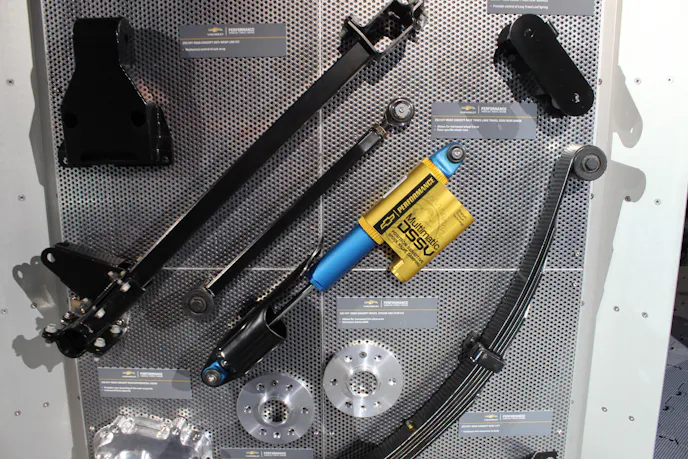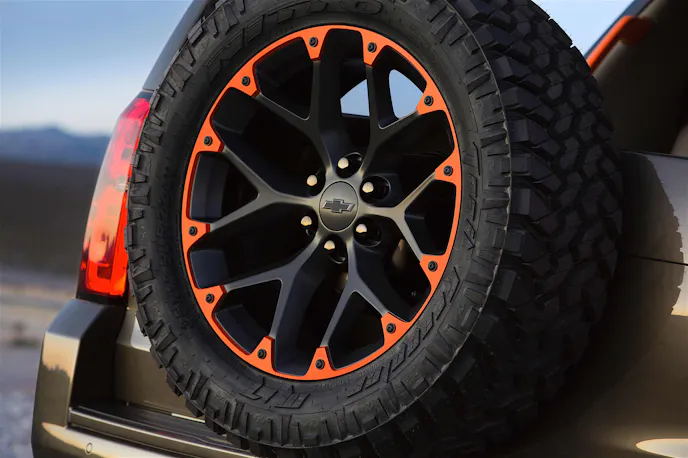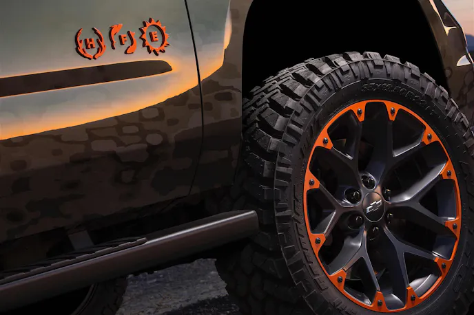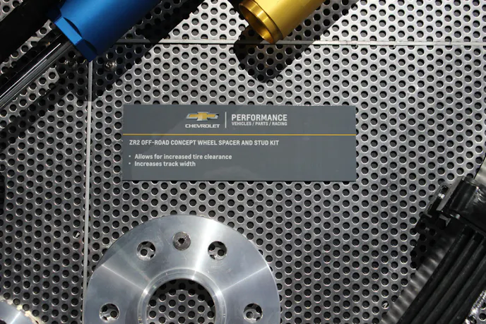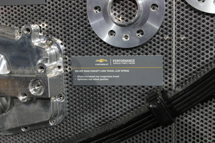 The truck also featured front six-piston Brembo brake upgrade kit in red, a 5.3-liter cat-back exhaust system with polished tips, and a performance cold-air induction system from Chevrolet Performance. In addition, the truck had 22-inch aluminum wheels (custom color for concept vehicle) and center caps, black bowtie emblems, a tri-fold tonneau cover, all-weather floor liners, and a rear under-seat storage organizer.