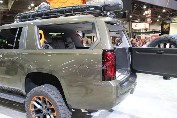 The concept also featured black bowtie emblems, a gooseneck completion package, black door handles, cargo area lamps, six-inch rectangular assist steps in black, tie-down rings, trailering camera system by EchoMaster, floor liners with the bowtie logo, an under-seat storage organizer, and an interior trim kit.