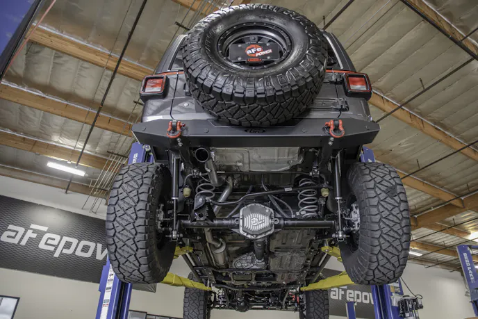 After the hood was all buttoned up, it was time to talk exhaust with Josh. “We have a lot of exhaust configurations available,” he said. “We currently have 27 for the JK, and JL units are quickly climbing.” Out of that impressive catalog of options, Josh went on to tell me about the configuration they chose for their signature Jeep. “For this one, we used the Mach Force-XP stainless Hi-Tuck cat-back exhaust for maximum clearance,” he explained. This particular vehicle was also rocking aFe’s Twisted Steel Y-pipe and Twisted Steel Loop Relocation Pipe.