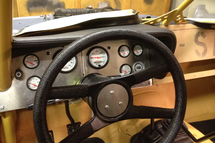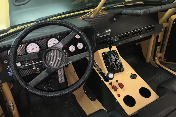 The upholstery is black vinyl, with custom gold stitching to match the Dune paint on the outside. That work was care of JT Custom Upholstery in Silt, Colorado. The custom dashboard houses AutoMeter Phanton II gauges, and all of it is protected by a two-inch .120-wall tube cage. “I put gussets all over the place,” said Chris. “The cage meets the floor in six places, and I put gussets wherever the cage met the floor.”