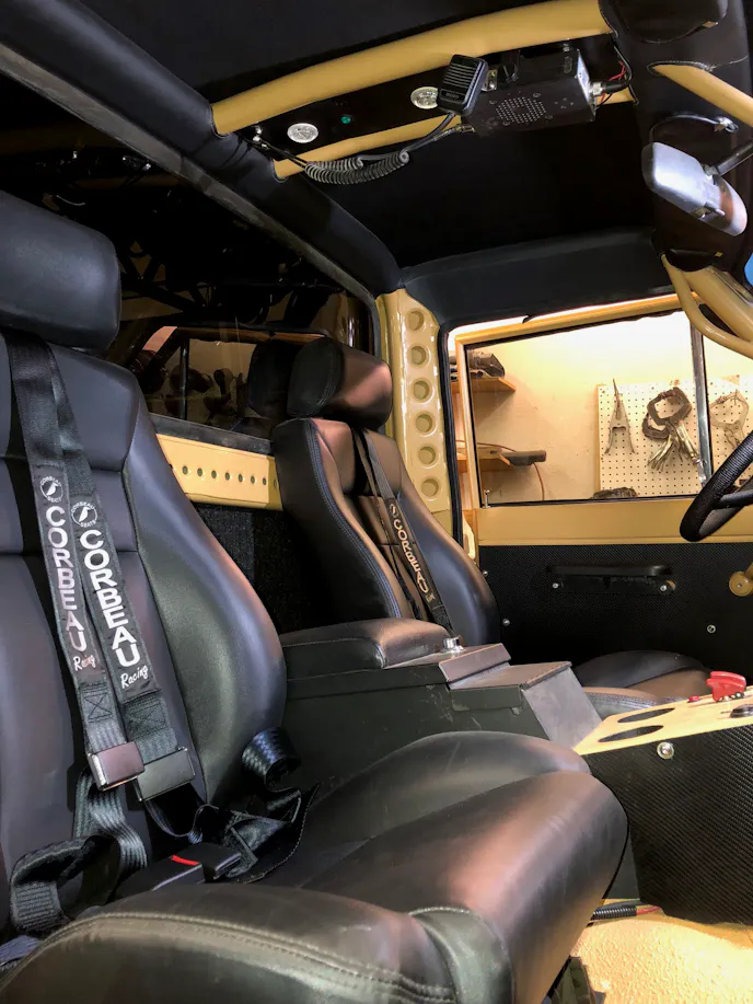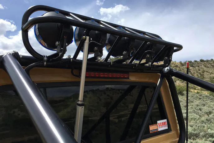 Lighting consists of three LEDs on the front bumper, and a light cage resting on the bed-mounted roll bar. There, Chris installed five seven-inch Lightforce halogen lights. These lights can tilt up and down thanks to an actuator, making the truck park-able in a standard garage.