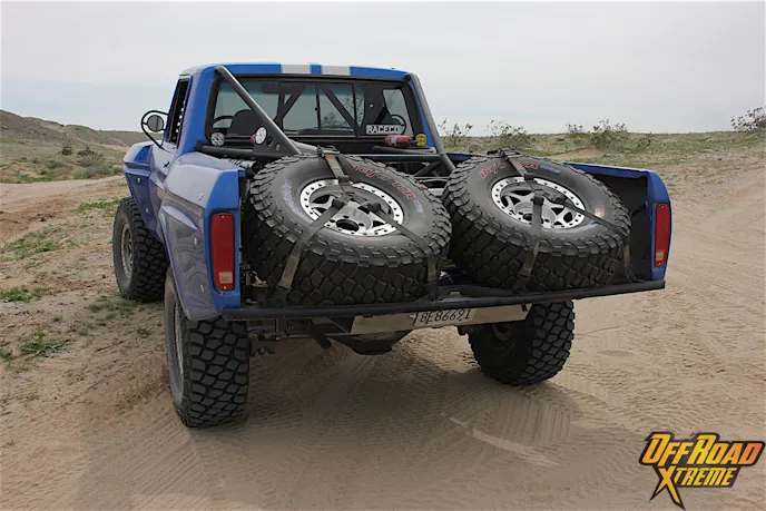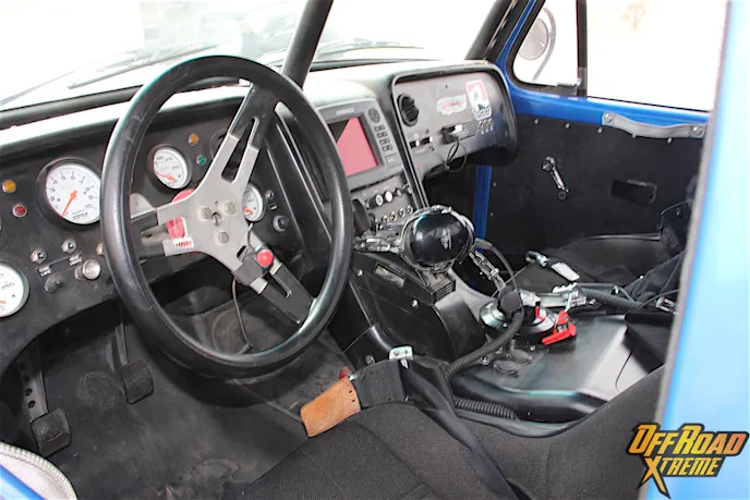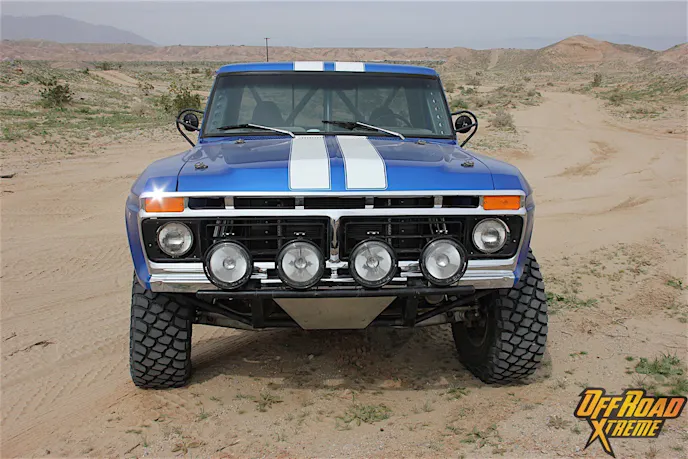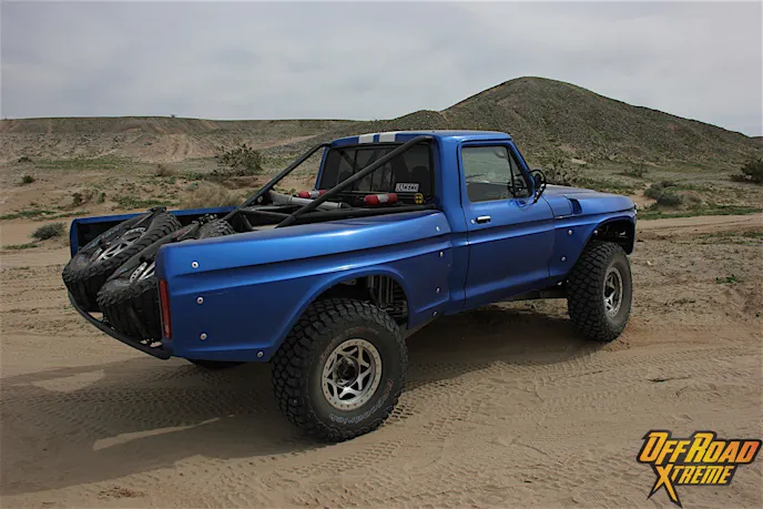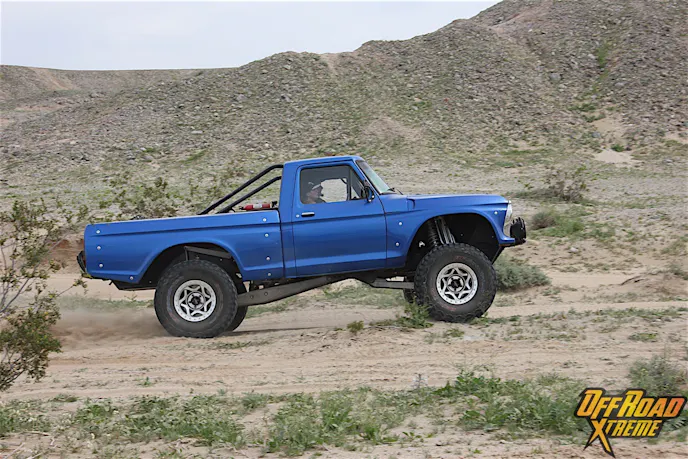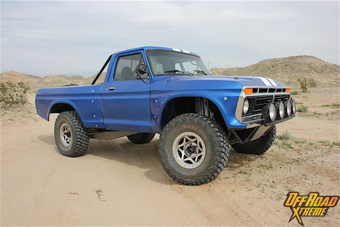 The F-100’s upgrades include a Dart 427ci V8, a Camburg rearend and front end, Fox shock absorbers, Walker Evans beadlock wheels, and a set of 37-inch BF Goodrich Baja T/A KR2s. All of it is complemented by an immaculate blue-and-white racing stripe color scheme, giving the Ford an outstanding appearance that drove us green with envy.