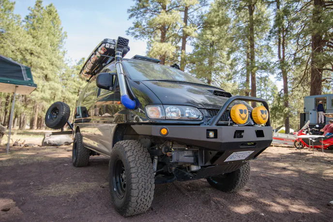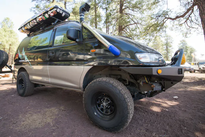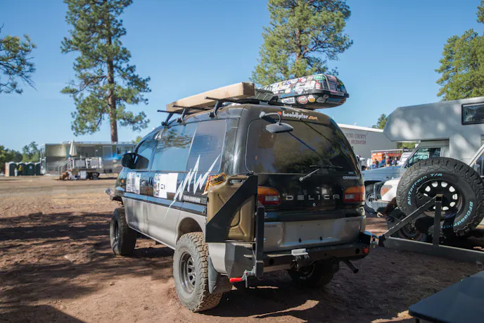 They’ve modified the Delica slightly to be able to comfortably complete the journey, adding a two-inch lift, more aggressive all-terrain tires, sleeping platforms and storage solutions, a homemade snorkel, front and rear custom bumpers, and a Dometic fridge/freezer. Living out of this small of a vehicle must be quite uncomfortable at times, but its small size allows it to go many places; places where a much larger overland truck will not fit.