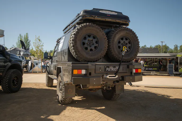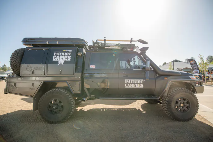 Based on the legendary Toyota Land Cruiser chassis, it comes from the factory insanely beefy, ready to take on any terrain. Patriot Campers upgrades the vehicle by adding a suspension lift, beefy Mickey Thompson MTZ tires, TJM front and rear bumpers, and a 300mm chassis extension to accommodate the custom Patriot Campers tray, which has storage all over it along with a built-in water tank.