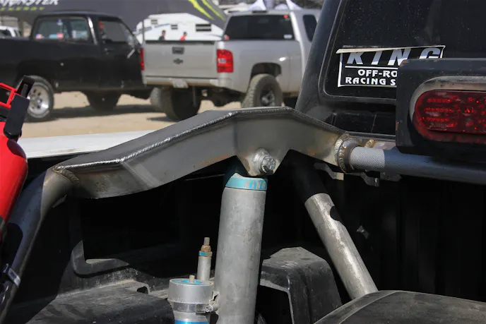 The rear suspension uses a DMZ 62-inch spring under conversion kit. This kit uses custom made 62-inch Deaver leaf springs that allow for up to 17 inches of travel. Those 62-inch springs are much longer than the factory springs, so Eric had to cut off all of the factory leaf spring mounting points and fabricate new ones in different locations. Eric made a custom bed cage and mounted a set of 2.5-inch King triple bypass shocks with about 16 inches of travel. Having slightly more travel in the rear would help with maintaining traction in really rough terrain.