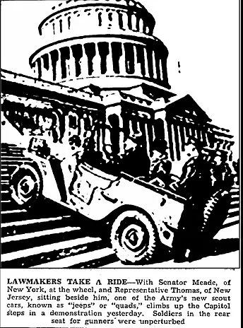 In 1941, what is known as the first press reference to the Jeep name was given in the Washington Daily News. Reporter, Katherine Hillyer had attended a press event on the military vehicle where Willys staged rides up the Capital’s steps to dignitaries to show off its latest creation (the Willys MA at that point).