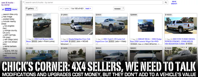 So let’s wrap this up. If you’re going to sell your 4×4, put yourself in the mind of the most generic, most vanilla car buyer out there. Think about what they might be watching out for while cruising Craigslist. If you can help it, maybe just post pictures of it on the street, and not getting hucked 30 feet and bottoming out the suspension.