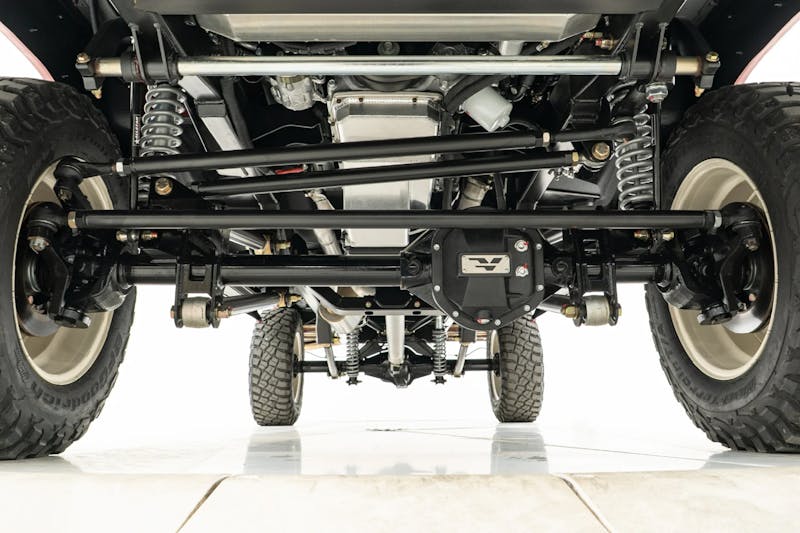 Where the F-150 and F-250 models truly shine is in their off-road capability. Unlike the street-focused F-100, these four-wheel-drive brutes are anchored by a Velocity-exclusive Roadster Shop chassis fitted with time-tested solid axles—Dana 44 up front and a beefy Dana 60 out back.