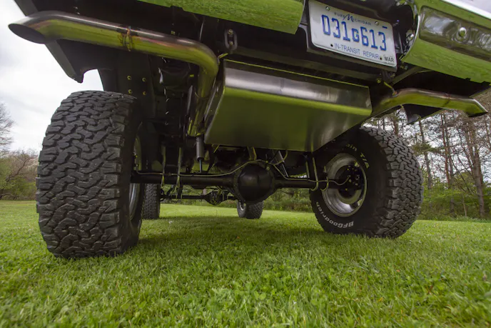 A venerable 4L60E automatic transmission smoothly operates with a Lokar shift linkage and sends the power downrange to an NP241C transfer case. The transfer case sports a JB Custom Fabrication single stick flush mount cable shifter as well as a 1-inch Zone drop bracket. From there the torque heads to a High Angle slip yoke eliminator and into a 1350 CV joint. The always-reliable GM 12 Bolt rear axle’s pumpkin is stuffed with a Yukon 4.56 ring & pinion and a Yukon DuraGrip limited-slip differential.