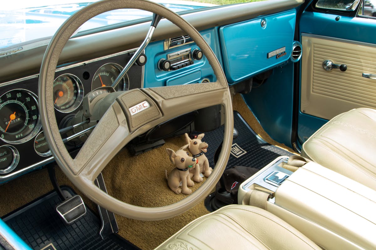 A few notable aftermarket upgrades and stock options that were added to Gary Knight’s 1970 GMC Jimmy during that time include a tilting steering wheel, a tachometer with a working vacuum gauge, a Hickey role bar, a bikini top, an AM/FM radio, and a soft top from the 4×4 accessory brand Bestop. You will also find some rally wheels, dual exhaust, tow hooks, and BFGoodrich T/A All-Terrain rubber under each corner.
