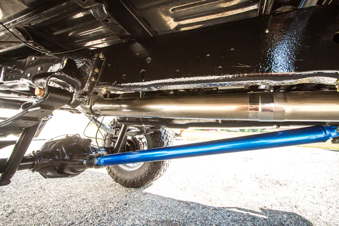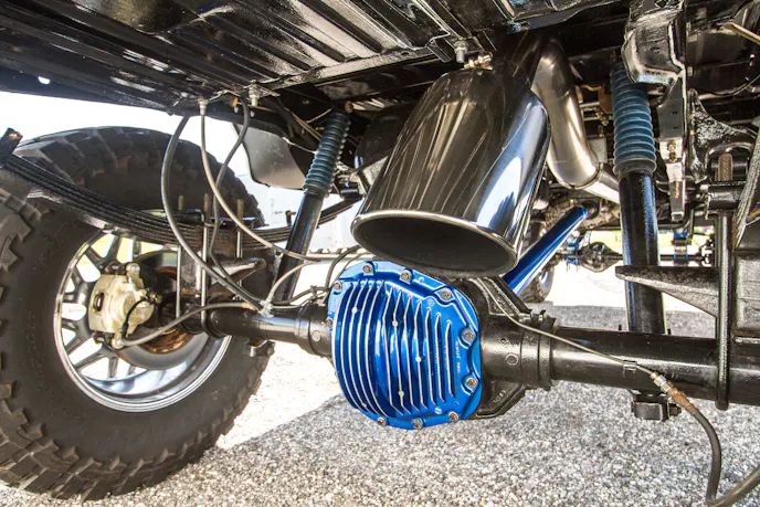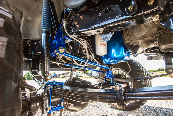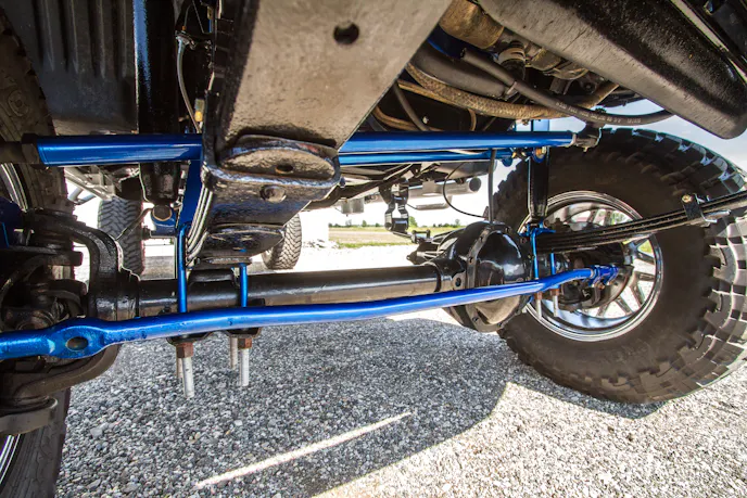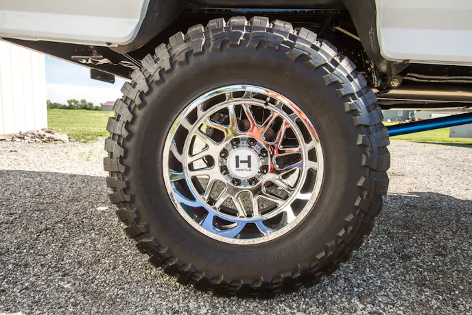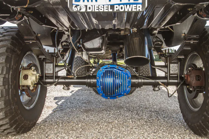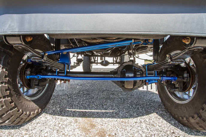 We find 8-inch custom lift leaves in the rear and Pro Comp traction bars locate the stock rear axle. A Ruff Stuff rear disc brake conversion was also used to ensure the big truck could be brought to a safe stop. Ballistic Fab 2-inch spacers are used in the rear to create a wide stance that accentuates the size of the build. Bronco Graveyard stainless braided extended brake lines were used all around so you can be sure the juice gets to the stock brakes.