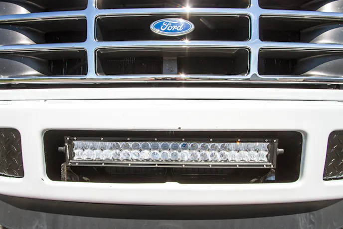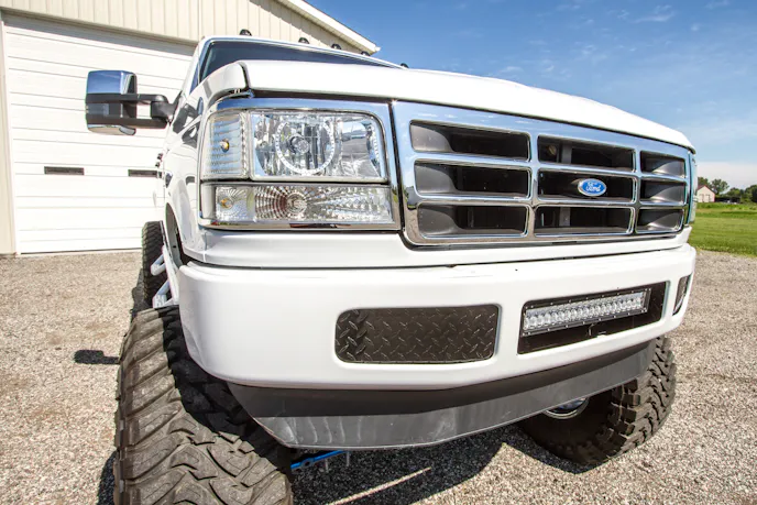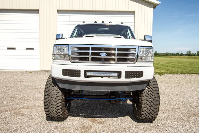 On the outside, most people just notice the sheer size of the truck. However, there are a lot of details to take in if you look closely. For example, a 2008 Super Duty front bumper replaced the original. It also holds a 22-inch light bar. The bar augments the clear headlights with halos to light up the night. Doug also added RGBW rock lights from Vengeance LEDs for those late-night runs.