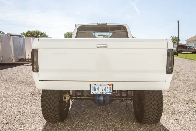 Duramax mirrors with conversion plates from Absalute Diesel provide Doug with excellent visibility behind the big ride. Super Duty smoked Recon cab lights and the custom diamond plate doorsills are also not to be overlooked. Doug even thought of getting in and out by adding N-Fab steps that are powder-coated in white. In the rear of the truck, the weld-on steel roll pan and smoked taillights, including the third brake light, give the rear a bit of attitude.