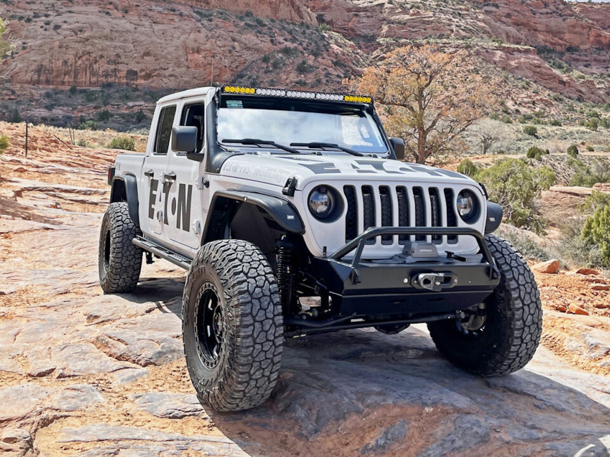 The first of the Eaton Jeeps is this 2021 Jeep Gladiator Rubicon. It’s a fine example of how to modify Jeep’s pickup truck. The company upped the output of the Gladiator’s V6 engine with a Magnuson Superchargers supercharger system. In stock trim, with no other system modifications, the supercharger is said to bump the V6’s output to 440 horsepower and 380 pound-feet of torque at the crank. Additionally, Eaton raised the truck’s height by 2.5 inches and fit it with 37-inch tires. The company also regeared the axles to 5.13:1 and fit the rear axle with its 35-spline ELocker electronic locking differential. Furthermore, the truck also has an army of aftermarket lighting and a collection of body mods. Finally, there’s a beefy winch and an array of trail-ready bits. Read on for all the details.
