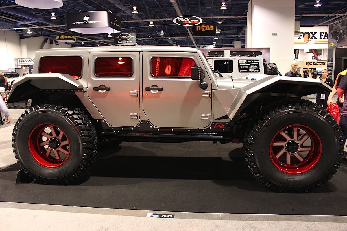 In the hot rod and show car culture, a chopped top is a pretty standard styling cue that builders will implement to give thier car a really sleek look. For the off road community, a chopped top is something you just dont see – until SEMA. In the Fab Fours booth this year, we came across this silver Jeep JK that had a chopped top, red-tinted windows, huge tires, and a truly menacing look. This truck had a crowd around it all week, and that should come as no surprise when you take one look at this thing.