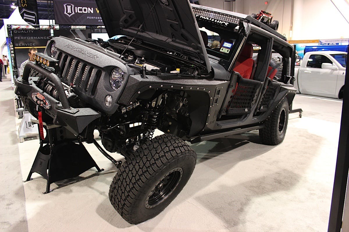 For the past couple of years, Jeep Wrangler JKs and Ford F150s have been the main show trucks at SEMA, and this year seemed to follow the same trend. Because of this, it can be very difficult to break free from the rest and get your JK or F150 to really stand out. Such is the case with ICON Vehicle Dynamics’ black Jeep JK on display at their booth that featured custom bumpers, a ProCharger supercharger, Rigid Industries light bar, a truck bed liner coating over the entire Jeep, and of course, ICON’s own Jeep JK adjustable coil over system that has proven to be very popular. This rig looks like it would be a blast to take on the trail.