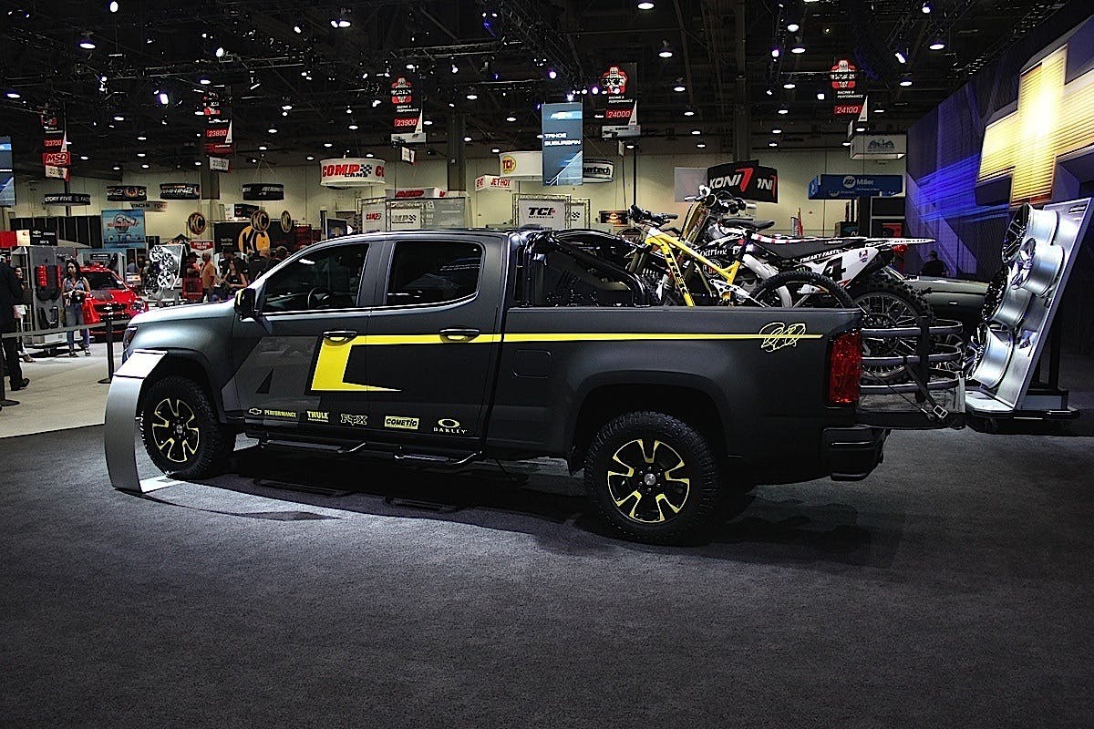 The small to mid-sized truck market has unfortunately been sidelined for the past few years by the American vehicle manufacturers with Ford discontinuing the Ranger, GM discontinuing the Colorado/Canyon, and Dodge discontinuing the Dakota. This void has allowed Toyota and Nissan to pick up even more marketshare which in turn, has shown the Big Three that there is still a market for the mid-sized truck. New for 2015 is Chevy’s all new Colorado mid-sized truck that has its crosshairs set firmly on the Tacoma and Frontier. What made Chevy’s display even cooler, was that they had Ricky Carmichael’s (best professional motocrosser of all time) dirt bike in the bed with a special RC4 liverly.