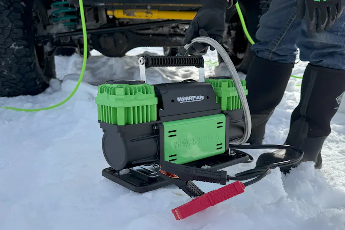 At the end of our frosty foray, we reconnected the Air Hub and Air Hub Quad 125 Hoses and added the TenSix compressor to air up our 37s. The total setup time was around 3 minutes. Inflation time from 10 psi to 35 psi was 3 minutes flat. We appreciated that we could complete other post-trail tasks while the MORRFlate system returned our tires to street pressure. In fact, it finished its task long before we got a few things stowed for travel.