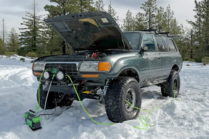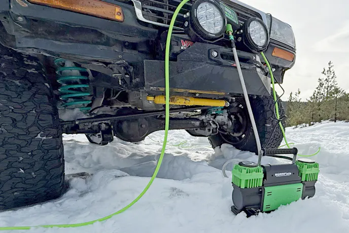 We had the opportunity to test MORRFlate’s TenSix Gen 2 air compressor, the Air Hub, and the Air Hub Quad 125 Hoses. Our primary testing took place at 5,500 feet above sea level during a winter trail run in Oregon’s Cascade Mountains. We were driving our 1994 Toyota Land Cruiser fitted with 37×12.50R17 BFGoodrich All-Terrain T/A KO2 tires. The tires are mounted on Method Race Wheels 105 beadlock wheels.