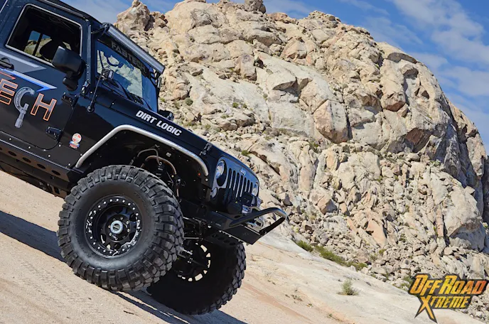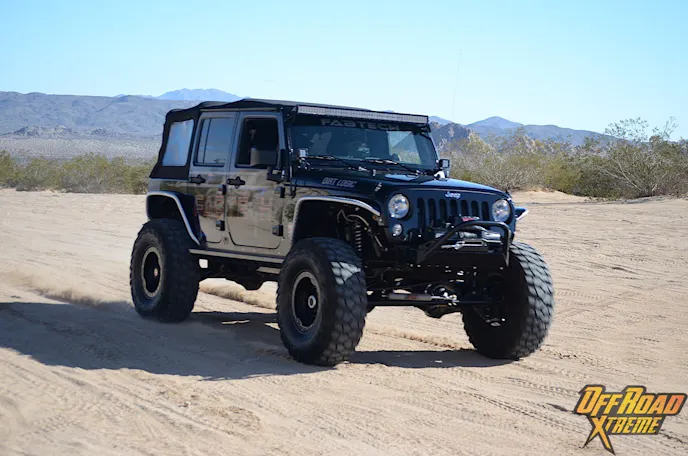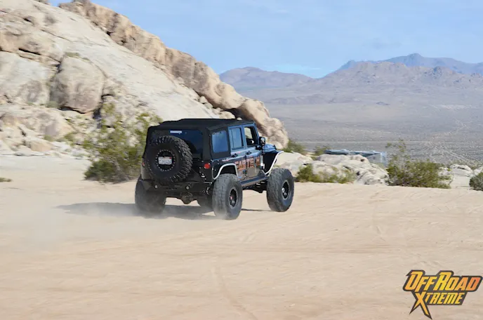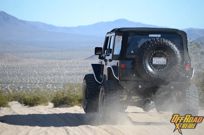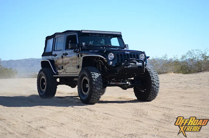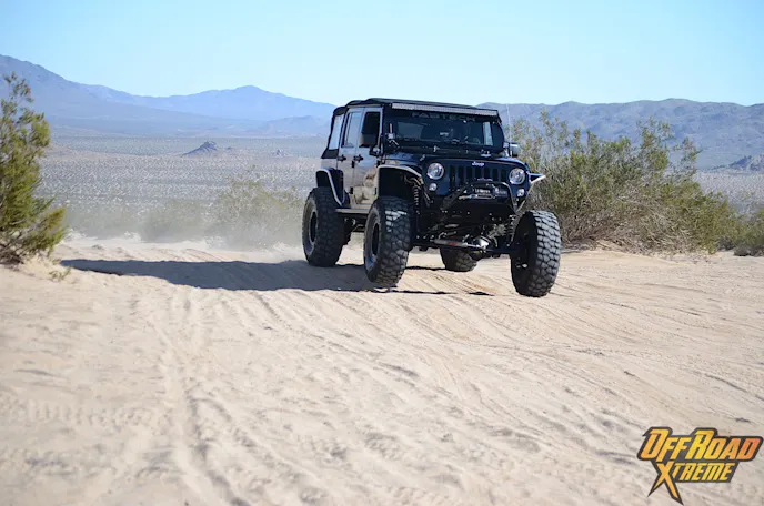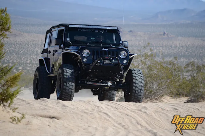 The Jeep was getting plenty of attention while it was displayed at the show, which made us more excited to see what it could do in the dirt, so Off Road Xtreme and Fabtech headed out to Cougar Buttes in the Johnson Valley OHV California’s Lucerne Valley.