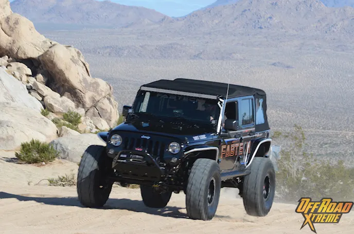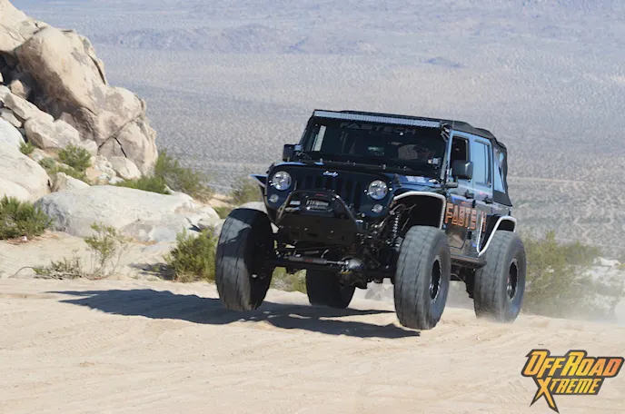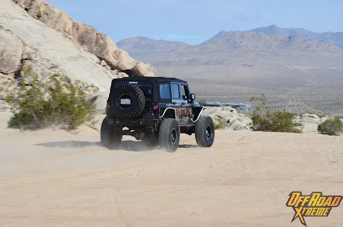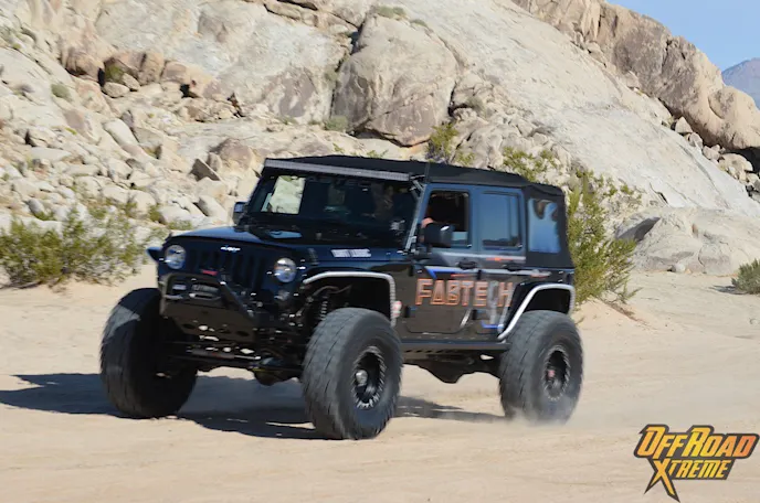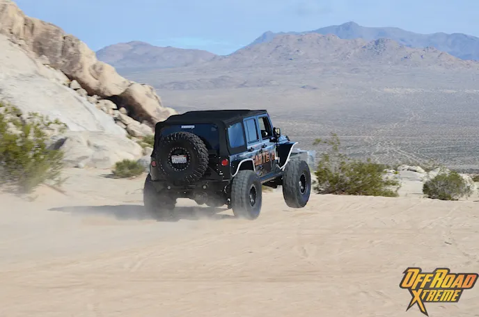 The Jeep was getting plenty of attention while it was displayed at the show, which made us more excited to see what it could do in the dirt, so Off Road Xtreme and Fabtech headed out to Cougar Buttes in the Johnson Valley OHV California’s Lucerne Valley.