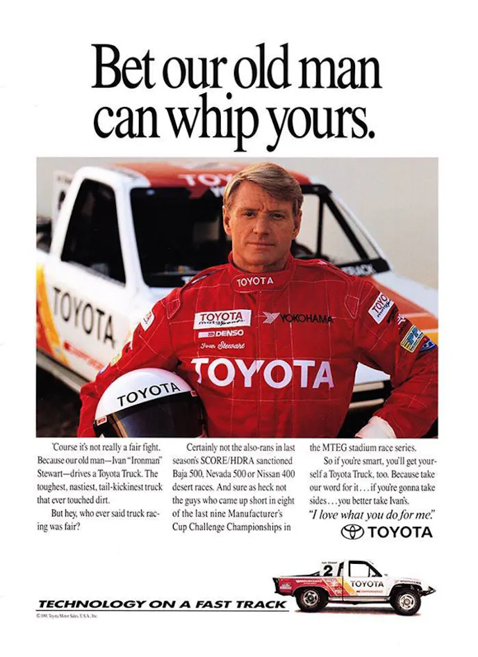 Fast forward 10 years, and Stewart was already an icon in his own right, having earned the nickname “Ironman” for winning a number of Valvoline Oil “Ironman” solo Baja race challenges in the mid-70s, and with 30 major race victories, as well as “Driver of the Year” and “Man of the Year” awards, the rising star was soon to shoot even higher as he next joined PPI Motorsports, sponsored by Toyota.