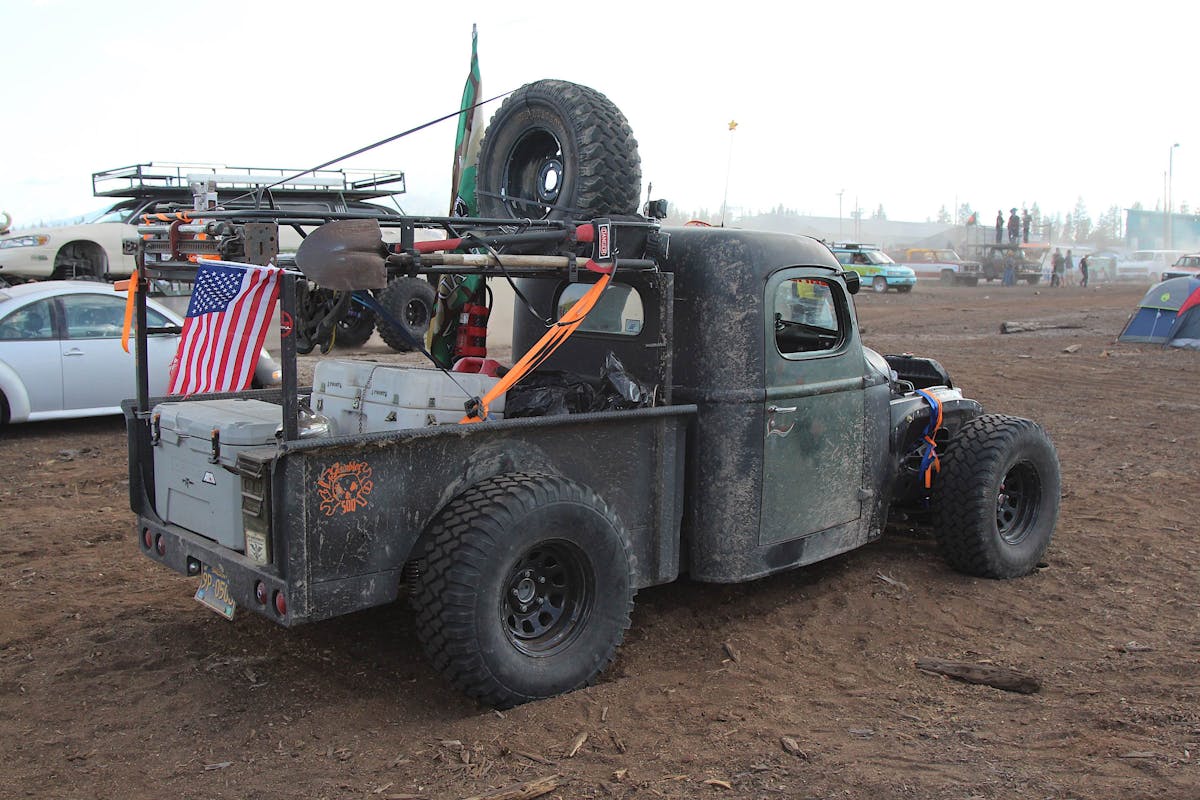 Seth explained with a laugh, “Coming out of Lebanon, Oregon, we hit a pothole. It broke a whole strut. The truck has a Camaro A-arm suspension and when that strut broke, it made the whole bed tilt. We were going on Highway 20 when the tire started rubbing and blew because of the heat and friction. A whole bunch of gamblers all got together and we got the truck jacked up. We had to cut the spare tire into pieces and shove the pieces in between the A-arm and the strut! It made it here immaculately. It’s pretty much held together with an old tire and ratchet straps.”
