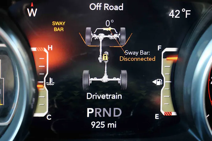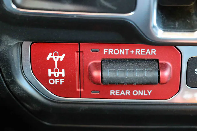 Sport and Sahara models run Dana 30 front and Dana 35 rear axles. Rubicons are equipped with an electronic front sway bar disconnect, Dana 44s, and Tru-Lok electronic locking diffs. For added grip in low-traction environments, a Trac-Lok limited-slip differential is available. The controls for the lockers and sway bar are located south of the HVAC dials… and left of the factory-installed quartet of upfitter switches.