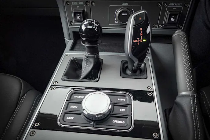 The Grenadier lineup has permanent four-wheel drive and features a manually operated two-speed transfer case with 4H and 4L (2.5:1 ratio produced by Tremec), as well as a standard center-locking differential. However, it can take a time or two to fully engage 4L it via its stout lever. Optional front and rear differential lockers are electronically actuated via ceiling-mounted push buttons. Front and rear lockers are standard on the Trialmaster but are factory available for the Fieldmaster and base Grenadier.