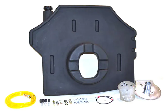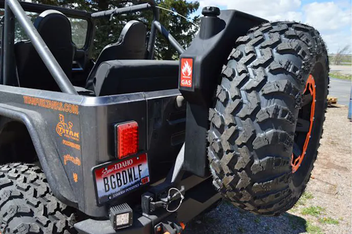 Their Titan Trail Trekker II™ Tank is specifically designed for off-road rigs. This transfer tank mounts to and straddles full size spare tires carried at the rear of the vehicle.