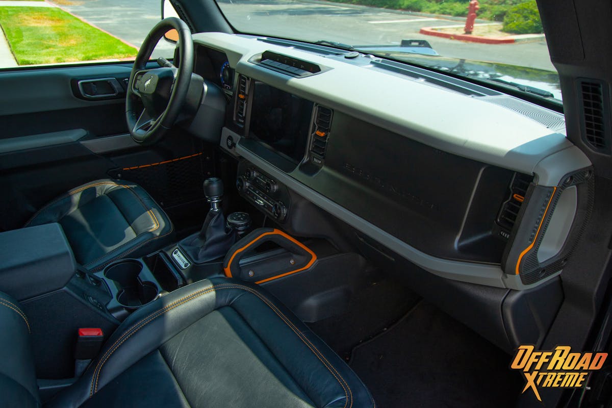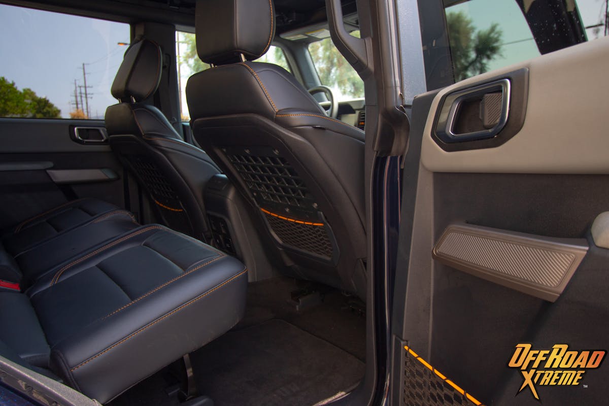 Our four-door Badlands was delivered in the deep shade of AntiMatter Blue Metallic and was decked out with the leather trim  and vinyl black interior. I found the bright orange trim and stitching to be rather pleasing and offset the dark interior purposefully. We can note that blue trim and stitching may be found on other packaged vehicles. Ford nailed down appropriate and available storage with useful net compartments, MOLLE strap system, a large center console, and glove box.