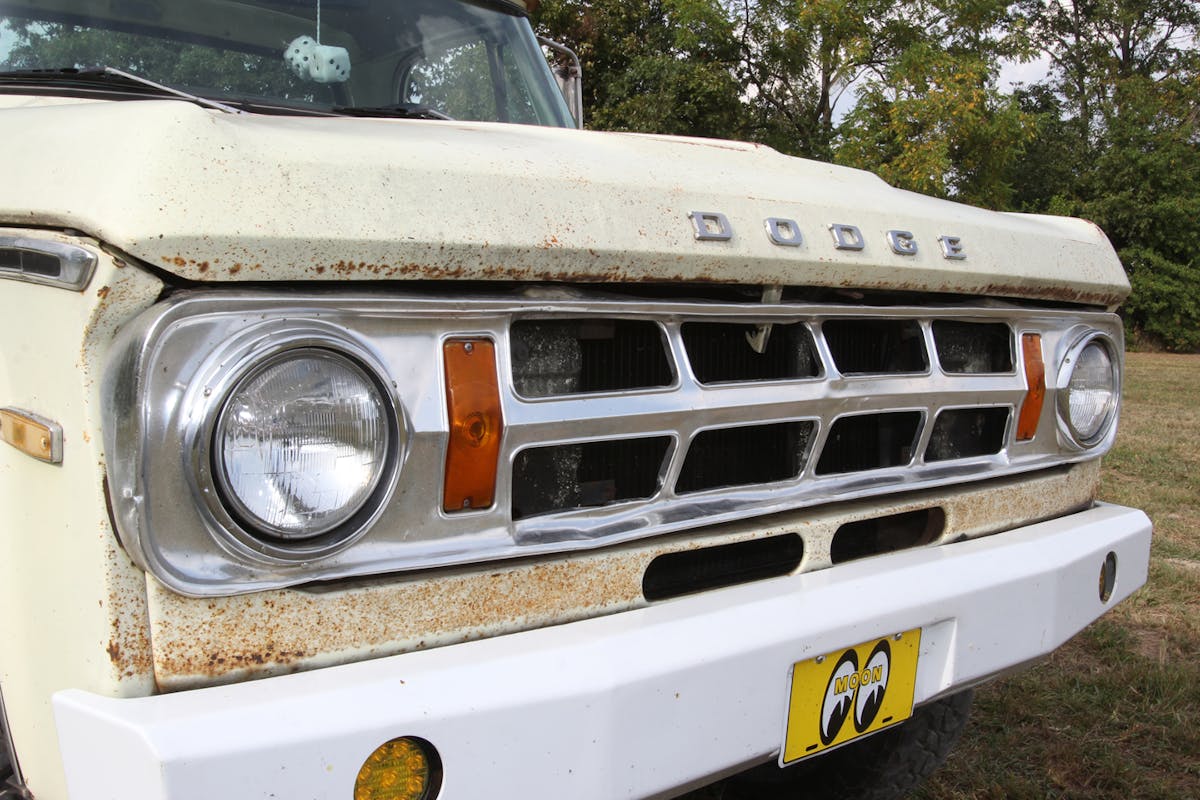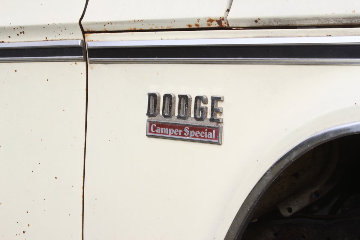 When Joe and June brought the 1970 Dodge D200 home, it was missing a front bumper. They fixed that by modifying a first-gen Dodge MOVE bumper to fit. Painted white and fitted with a pair of LED lights, it blends perfectly with the truck’s no-nonsense look. Otherwise, the D200 wears its factory paint, and decades-deep patina. Even the original “Camper Special” emblems still hang on the front fenders.