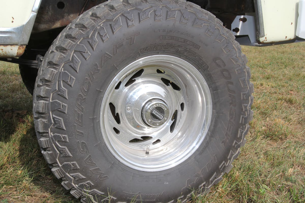 June’s truck rolls on 315/75R16 (approximately 35-inch-diameter) Mastercraft Courser MXT tires mounted on 10-inch-wide Weld Scorpio V wheels.