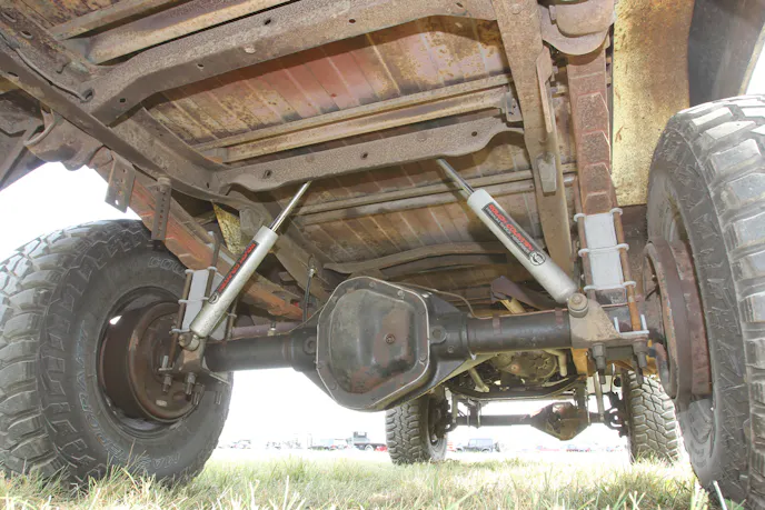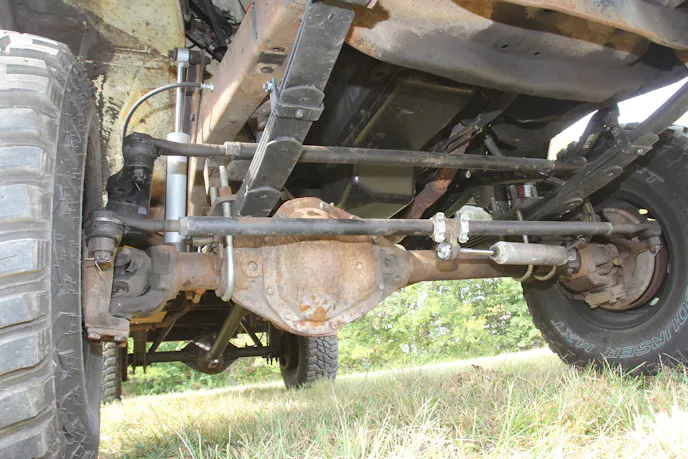Up front, the factory leaf springs and shocks were ditched for five-inch-lift first-gen Dodge-spec BDS springs paired with Rough Country shocks. Out back, the stock leafs stayed, Rough Country shocks went in, and lift comes from custom U-bolt-capturing blocks.