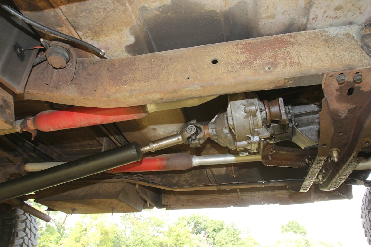 Joe and June swapped in a pair of axles sourced from a first-gen Dodge. The rear is a Dana 70, and the front is a Dana 60 with Warn manual locking hubs. Both have 4.10:1 gears. The steering system is a custom crossover setup that includes an IFS Toyota steering box, hydraulic assist, and a Jeep steering shaft. “It drives amazing now,” Joe says. At the time these photos were taken, Joe was fabbing the front driveshaft.