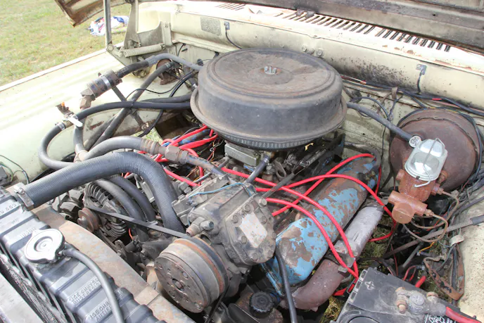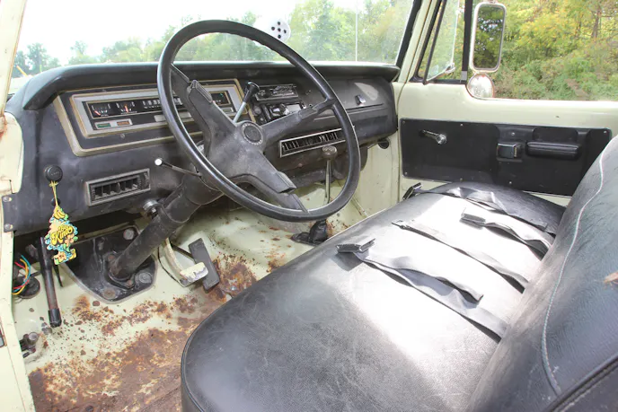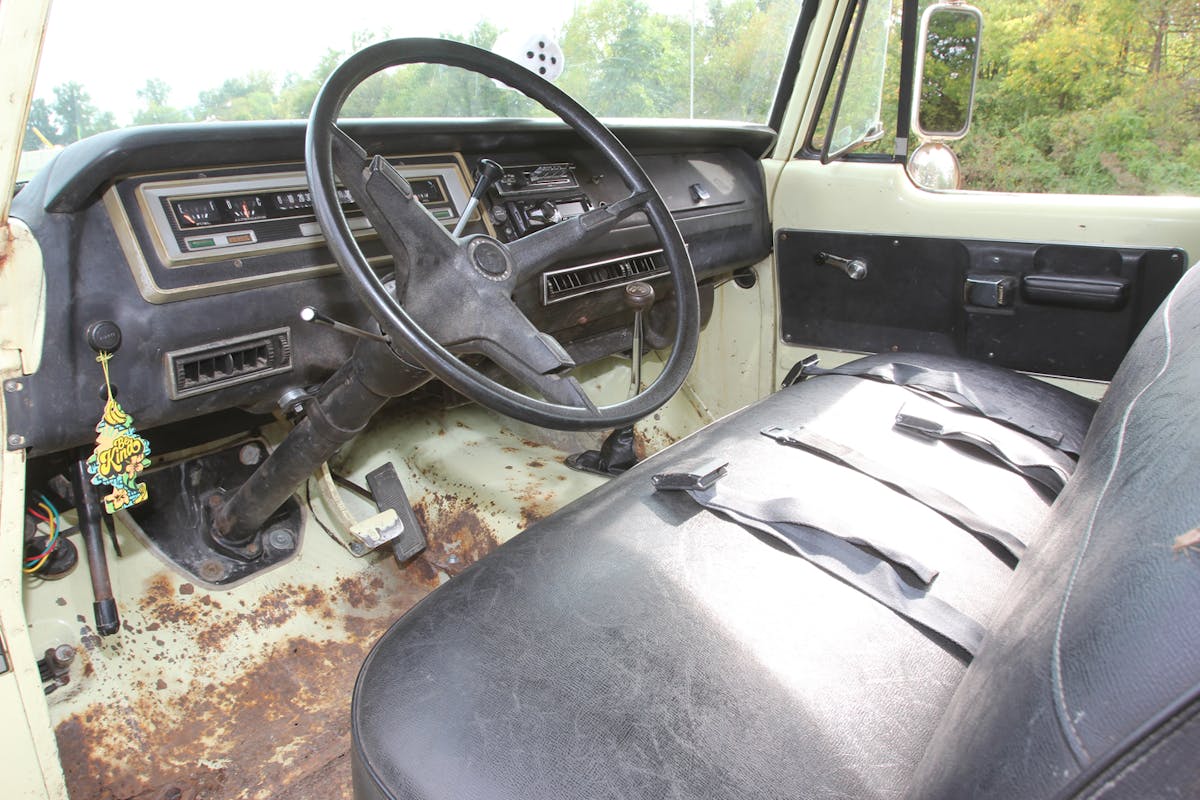 Under the hood sits a 383-cubic-inch big-block V8 that’s mostly stock, save for a Holley carburetor and PerTronix electronic ignition. Dual exhaust with glasspack mufflers handles the spent gases. The stock radiator’s been re-cored, and a rear-sump Mancini Racing oil pan makes room for the four-wheel-drive conversion and crossover steering.