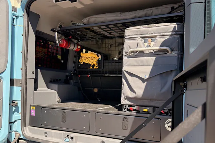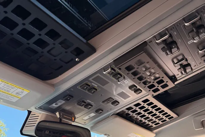 Inside, the Grenadier packs smart storage and trail-ready gear. An Engel 40-liter fridge-freezer rides on a sliding mount alongside the solar power system components. Wyn made use of nearly every inch of interior space, aided by several aftermarket additions. These include a Bison Gear roof shelf that stores the RTT ladder when not in use, overhead cubby shelves, a LeTech drawer system, and strategically placed MOLLE panels. A pair of Quad Lock phone holders mounted to a dash panel phone bracket on the center console keeps navigation and communication within easy reach.