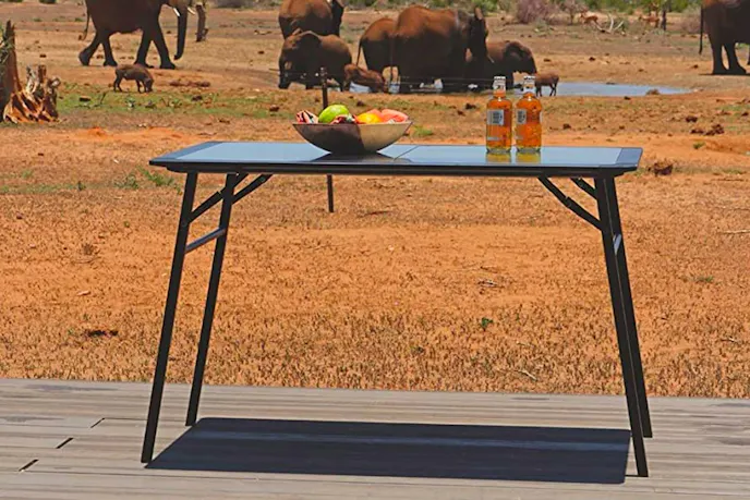 - The table frame and legs are powder-coated black with corrosion-resistant coating.