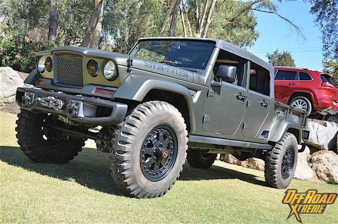 Along with the Jeep Wrangler Trailcat concept and FC 150 , the company also brought along the Crew Chief 715 concept. A nod to the Kaiser M715, this four-door sports a four-inch lift kit, Dana 60 axles, and 3.6-liter V6 with a five-speed automatic transmission. Jeep envisions this concept as "the type of vehicle the base commander would drive."