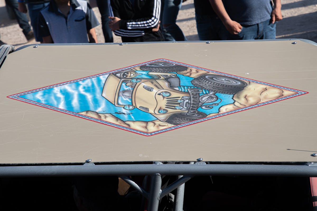 With the wheels on, paint was the next step to tackle. Originally black, the new sand-colored paint with black accents ties right into the Wrangler’s understated look. Now one thing that wasn’t going to stay understated would be the mural on the roof. “We had one on our sand buggy slingshot and knew we needed one on the Jeep. Pete “Hot Dog” Finlan was the designer and painter of the Mural out of his shop Hot Dog Kustoms in Temecula, California.